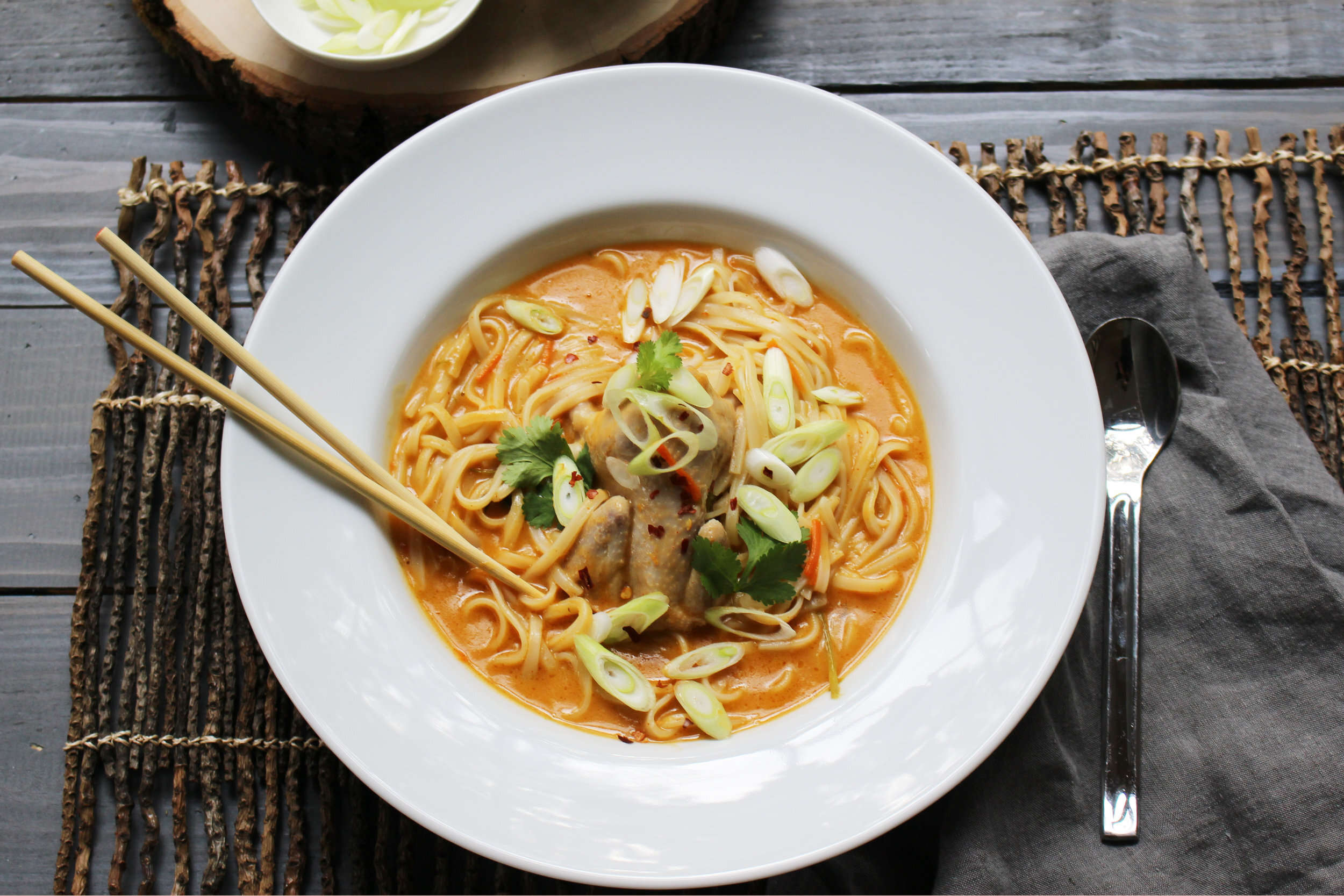 The combination for red curry with coconut milk is just outstanding in my book. The subtle notes of the lime leaves, heartiness of the noodles and sweet poached quail will make you want to repeat this recipe in your kitchen!