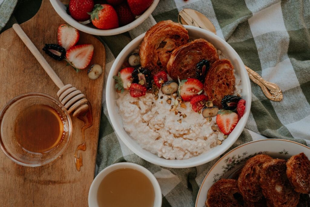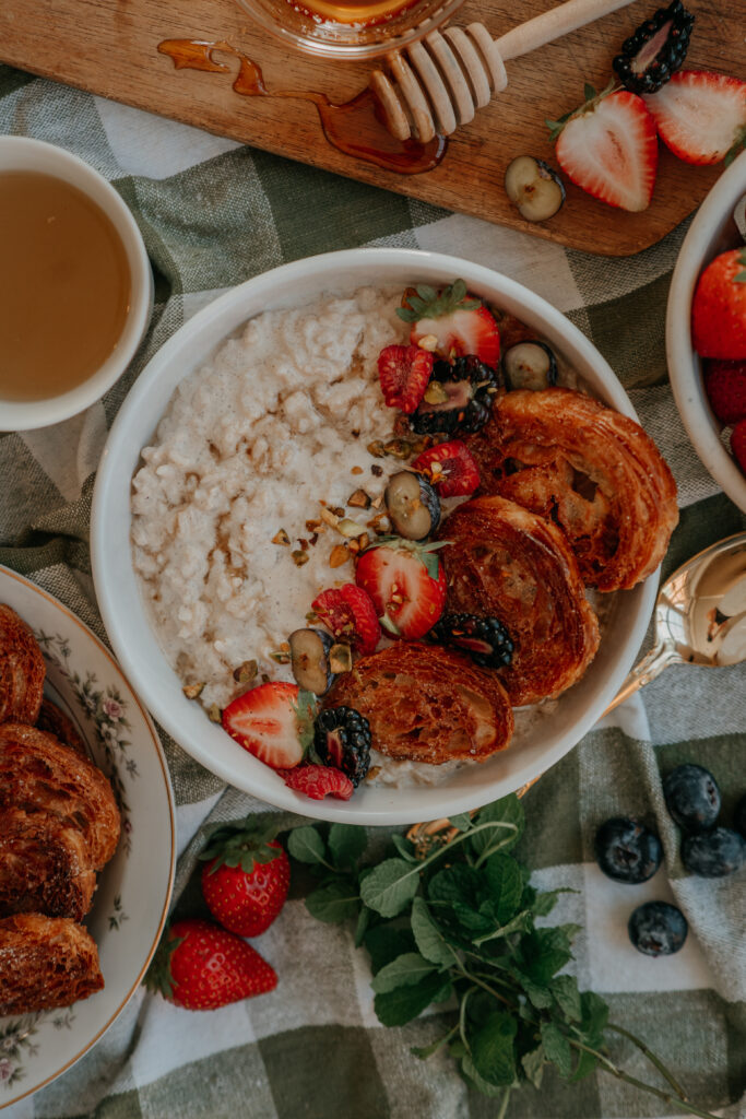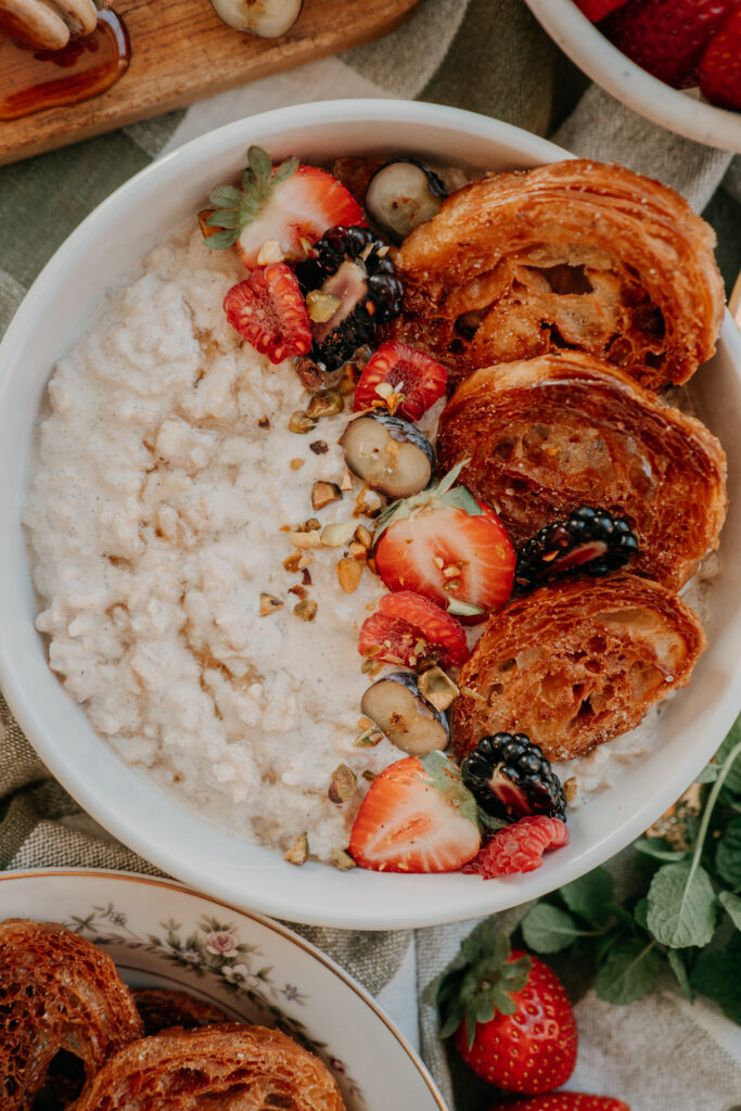 Serve the rice pudding warm, topped with the croissant chips. I also like to add fresh berries and a drizzle of honey.